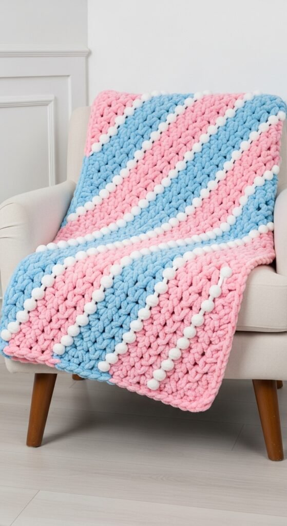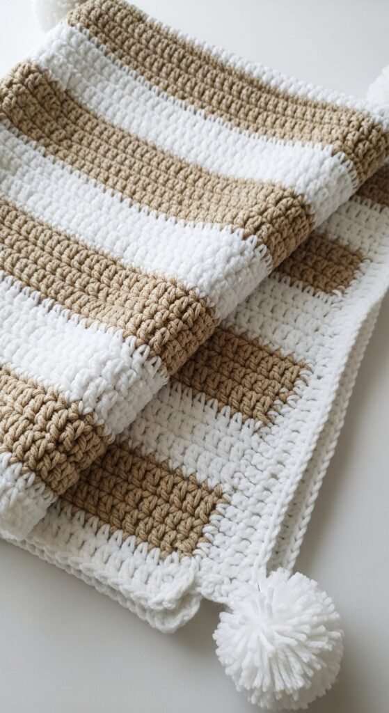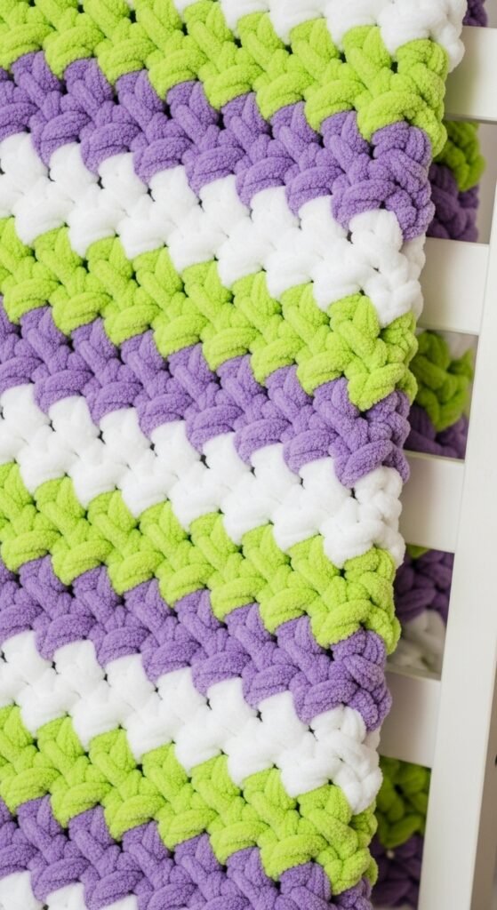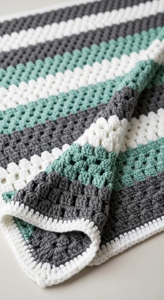 The weight of this blanket is substantial. It provides that comforting “weighted blanket” feel that helps babies sleep longer. From a design perspective, this is a great candidate for self-striping cakes or variegated yarns. The simple repetition of the stitch breaks up color pools effectively, resulting in a sophisticated watercolor effect without any extra effort on your part.
