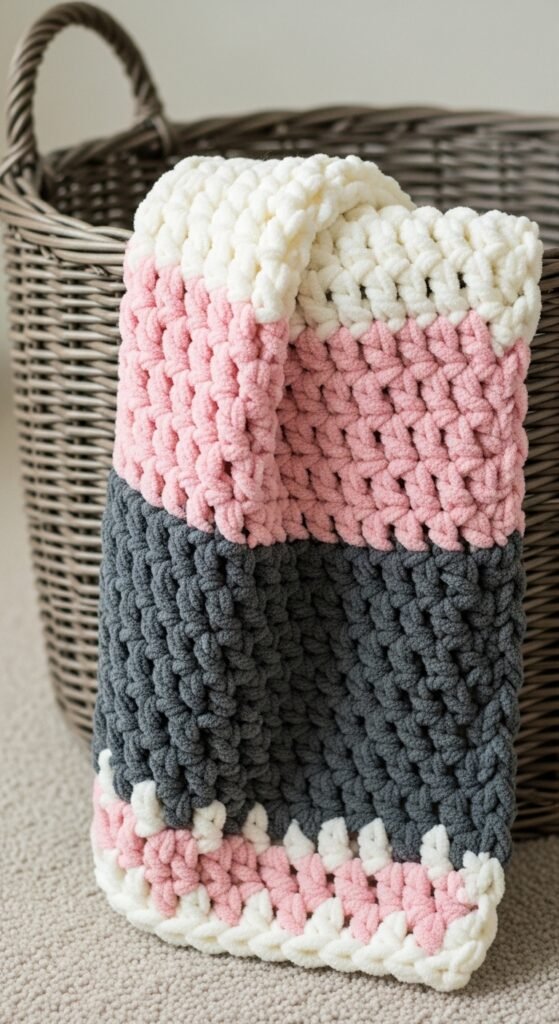 The aesthetic here is “hygge” to the max. It looks inviting, cozy, and incredibly soft. Because the stitches are so large, the blanket has a fantastic drape and squish factor. It is perfect for a last-minute baby shower gift when you have forgotten to buy something until the morning of the event. You can start this after breakfast and have it wrapped by lunch.