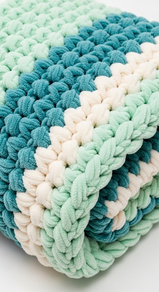 This is the ultimate sensory blanket. It is thick, plush, and incredibly warm. Design-wise, simple stitches are best here because the yarn is so fuzzy that complex stitch definition gets lost. A simple half-double crochet or moss stitch allows the yarn’s texture to be the star of the show. It is like hugging a cloud.