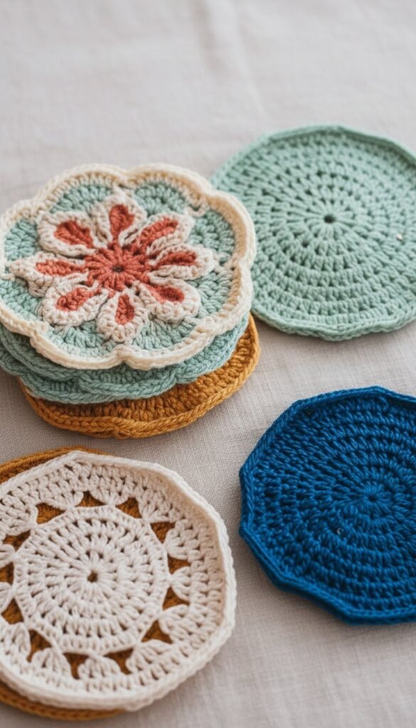 Coasters are the perfect entry-level gift that looks chic in any home. They are small canvases for experimenting with new stitch patterns or colorwork without the commitment of a blanket. Current trends favor “Boho” styles with fringe, hexagonal shapes, or floral motifs that look like daisies or sunflowers. A set of 4 or 6 tied with a rustic twine makes a complete, ready-to-give package.