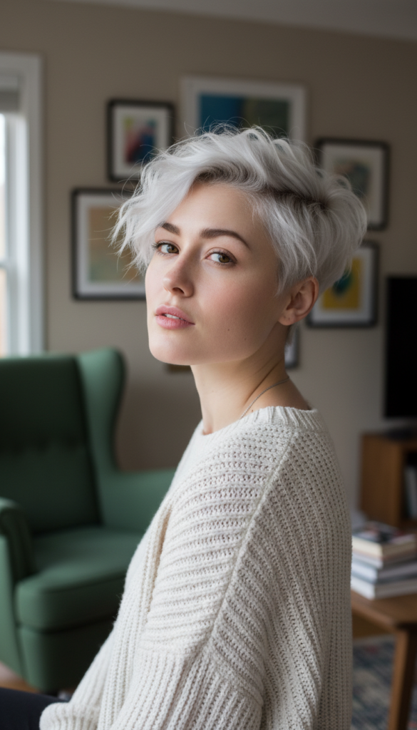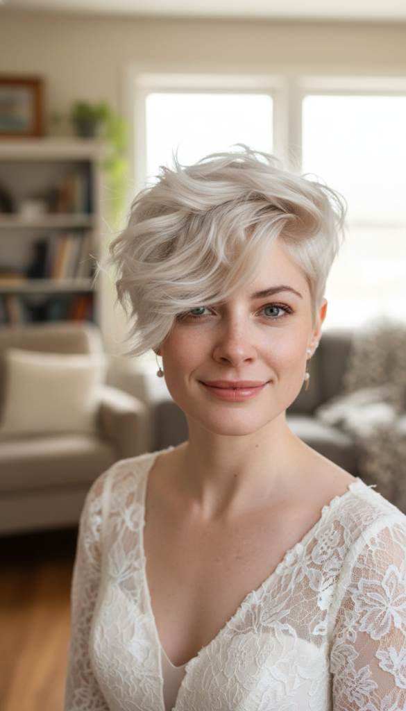 Who says pixies have to be straight? The wavy pixie is a bold, high-fashion statement that combines the ease of short hair with the texture of waves. This cut is longer on top, allowing the natural wave to form, while the sides and back are tapered close to the head for a clean silhouette. The platinum color adds a futuristic, edgy element that makes the texture pop. It is a fearless look that highlights the cheekbones and eyes.