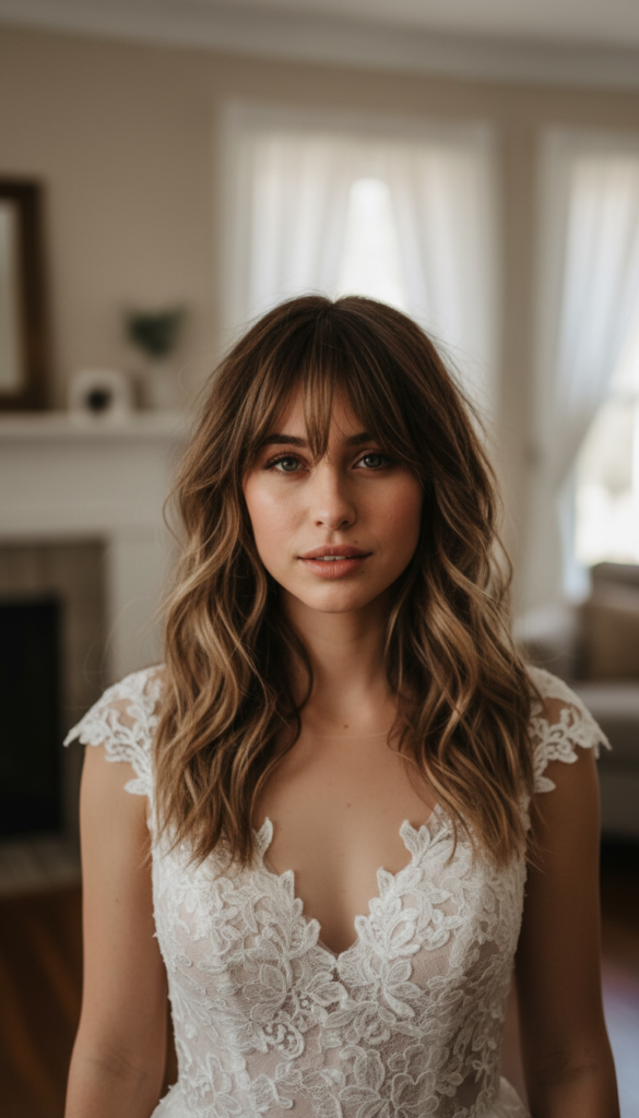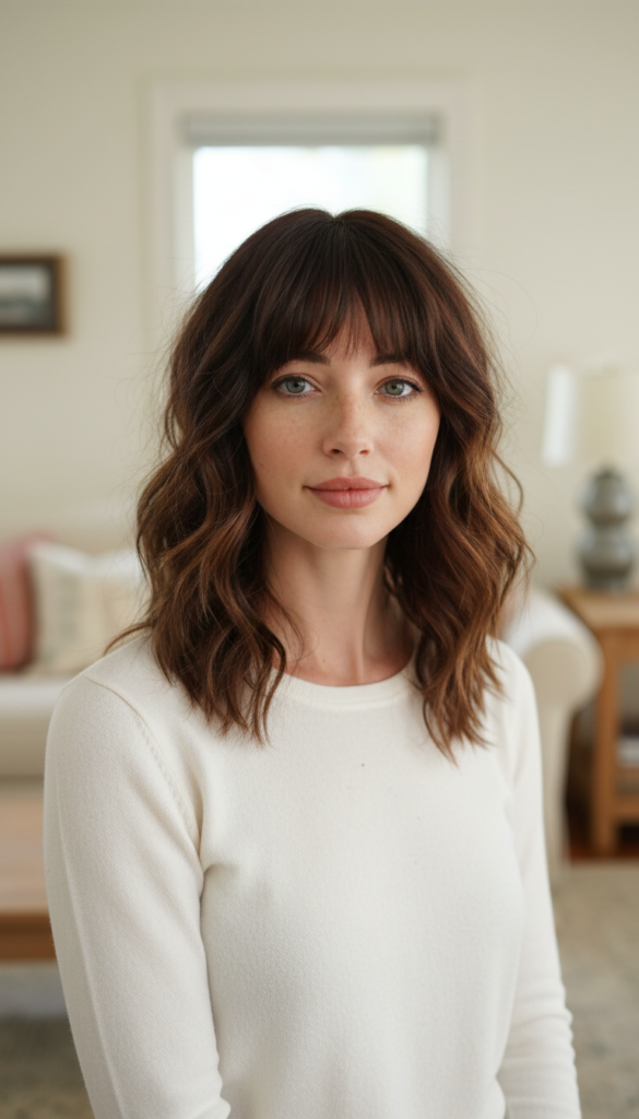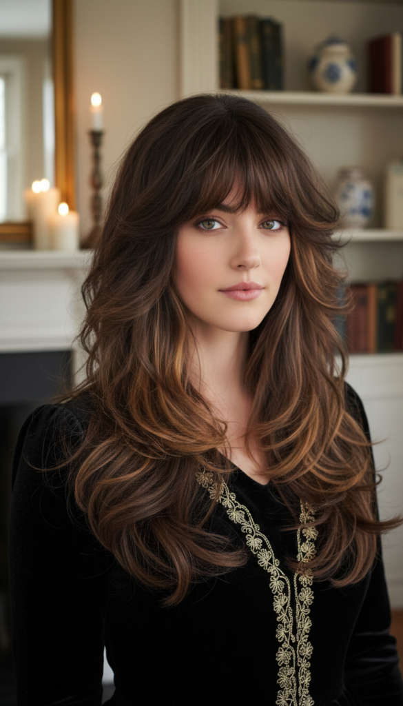 Full, heavy bangs are a bold choice that pairs wonderfully with voluminous wavy layers. This look frames the face completely, drawing intense focus to the eyes. The layers throughout the hair add width and body, creating a “lion’s mane” effect that is powerful and sexy. This style works best with thick hair that has enough density to support both the heavy bangs and the length.