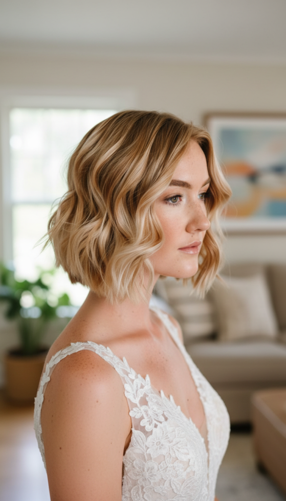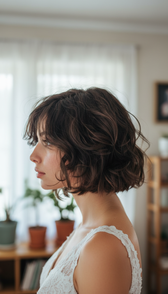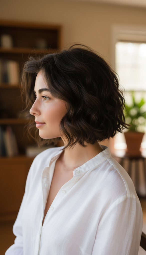 The casual wavy bob is the “t-shirt and jeans” of hairstyles—classic, comfortable, and always stylish. It sits just above the shoulders and features minimal layering. The texture is soft and touchable, avoiding the crunchiness of strong-hold products. It is a versatile cut that can be tucked behind the ears for a cute, preppy look or worn loose for a relaxed vibe.