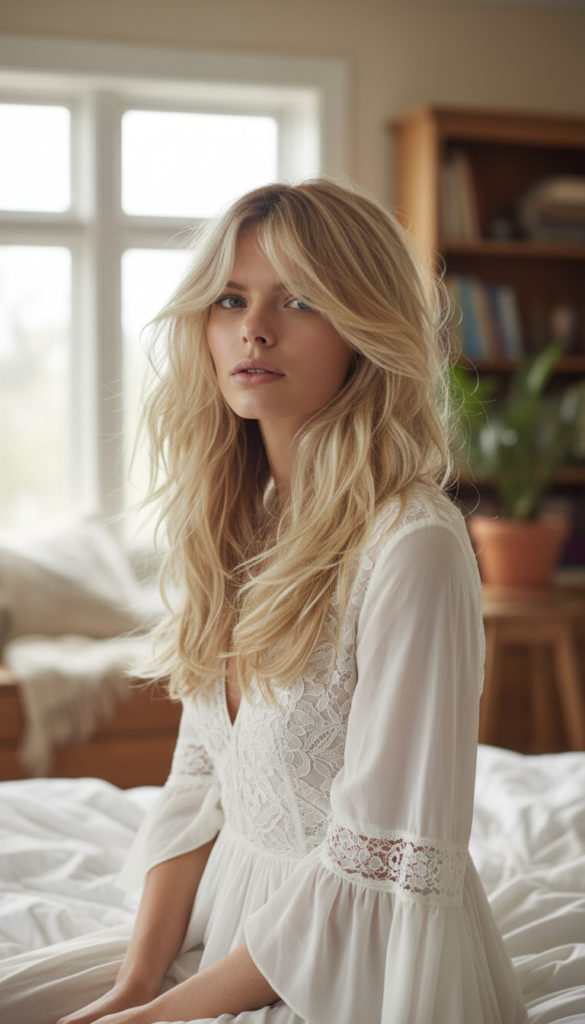 The modern shag has cemented its place as a dominant trend, and this blonde variation is the epitome of rock-and-roll chic. Characterized by choppy layers throughout the crown and mid-lengths, this cut removes significant weight, allowing the natural wave to spring up and create massive volume. The “messy” aspect is intentional; it is a rebellion against the overly polished glass-hair trends of the past. The blonde dimension highlights the choppy texture, making every layer visible and distinct.