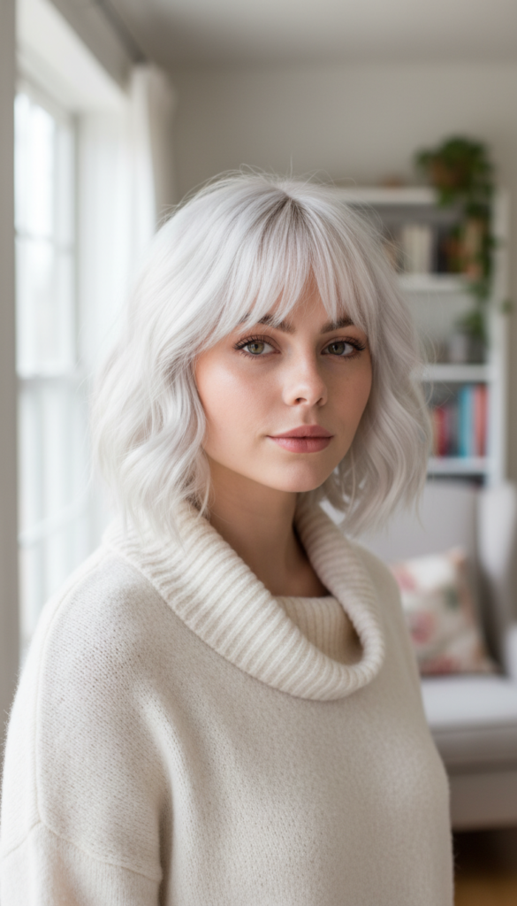 Color plays a huge role in the impact of a haircut. This icy blonde bob is sharp, cool, and modern. The pale, almost white color creates a striking contrast with the skin, while the wavy texture softens the severity of the color. The side-swept bangs add a classic touch that makes the look wearable and flattering.