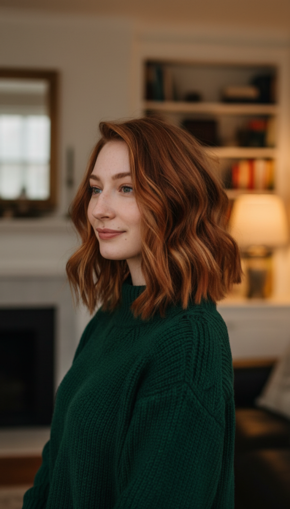 The “Lob” (long bob) continues to be a top request in salons, but this iteration introduces a vibrant warm copper tone that is trending heavily this year. The cut hits the collarbone, a universally flattering length that elongates the neck. The loose waves in this style are less about tight definition and more about a gentle “S” bend that catches the light. The copper color enhances the visual texture of the waves, making the hair look glossy and multidimensional.