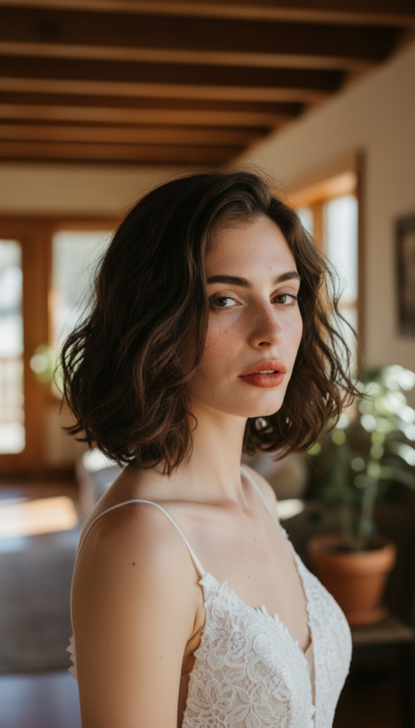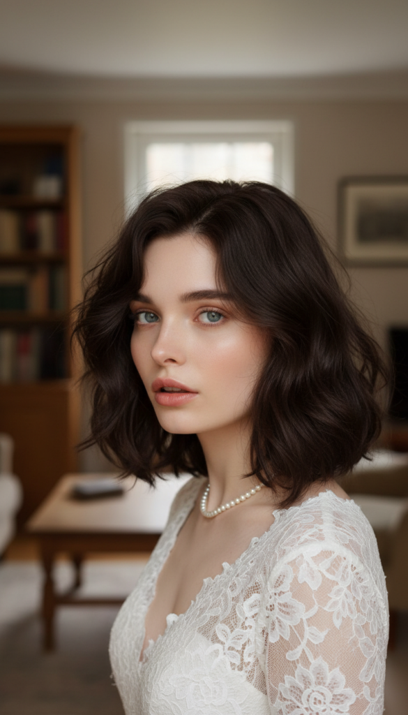 For those who prefer a moodier, more mysterious aesthetic, the dark wavy lob is a stunning option. This cut features a blunt perimeter which gives the hair a thicker appearance, contrasted by subtle internal layers that provide movement. The “soft tousle” refers to the styling technique where the waves are broken up and relaxed, rather than uniform ringlets. The dark color acts as a solid canvas, emphasizing the silhouette of the cut rather than the individual strands.