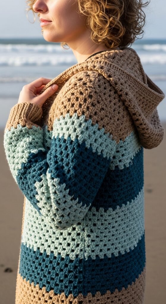 This pattern is a celebration of color and scrap yarn. The Sea Glass Jacket uses a technique where you change colors frequently, often every row or round, to create a mosaic effect that resembles stained glass or sea glass found on the beach. It is a stunning “stash buster” project.
