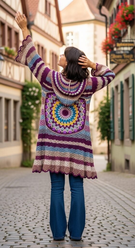 Bohemian style reaches its peak with the Lotus Mandala Duster. The construction begins with a large, intricate mandala circle on the back. As the circle grows, it eventually squares off or develops armholes to transform into a wearable garment. The back view is absolutely breathtaking and serves as the focal point of the outfit.