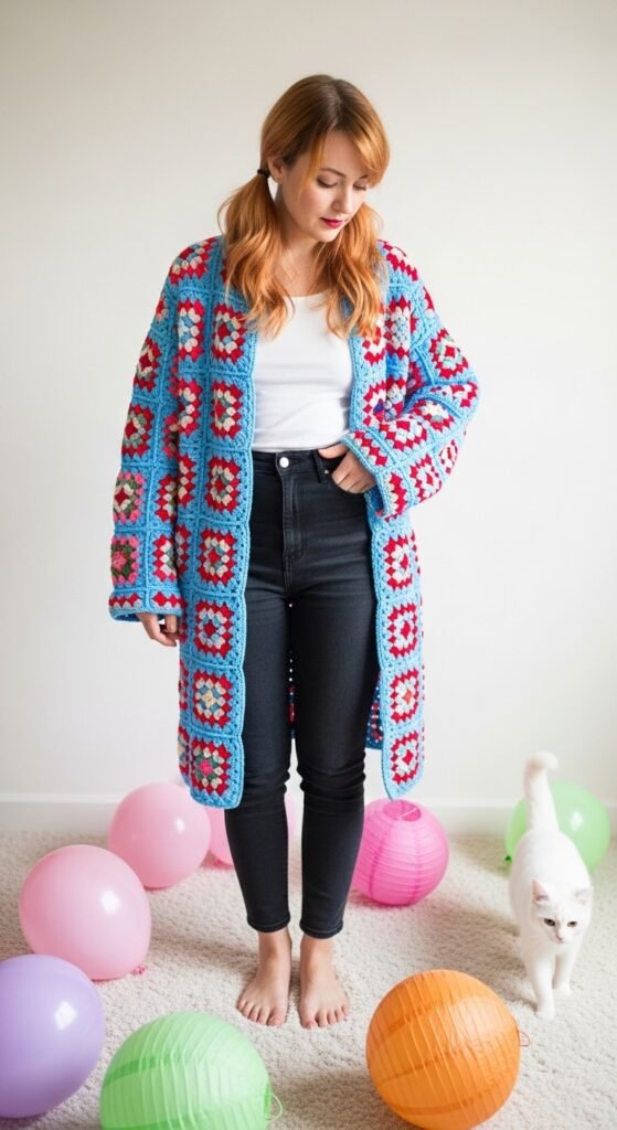 This pattern allows for infinite creativity. You can curate a specific palette, like pastels or neutrals, to make the sweater feel cohesive. The open nature of the granny stitch makes this garment airy, so it works well as a layer over a turtleneck in winter or a tank top in spring.