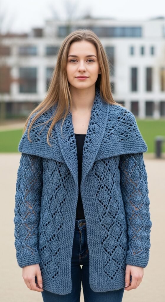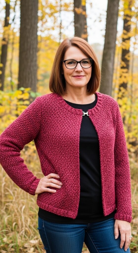 The length is often cropped or hits just at the hip, making it a great companion for dresses. The open front design encourages layering. Using a yarn with a slight halo, like an alpaca blend, enhances the softness and gives the cardigan a luxurious, fuzzy aura.