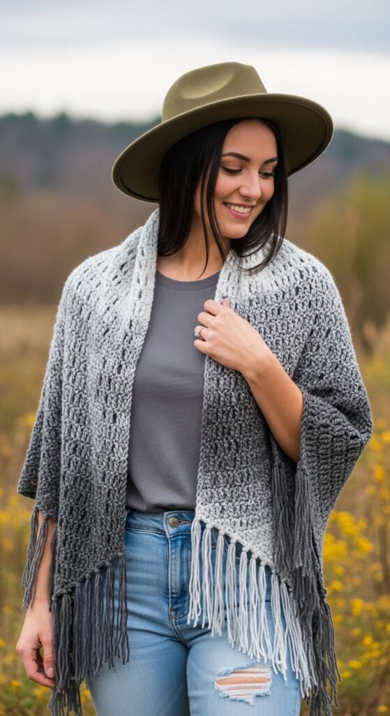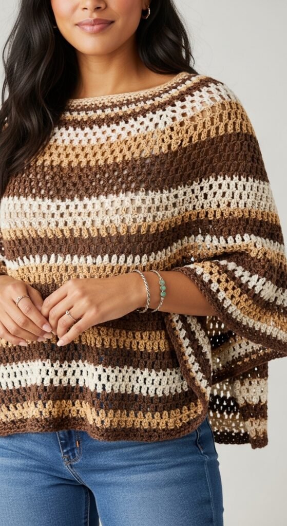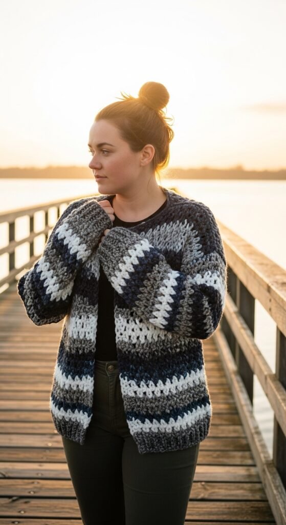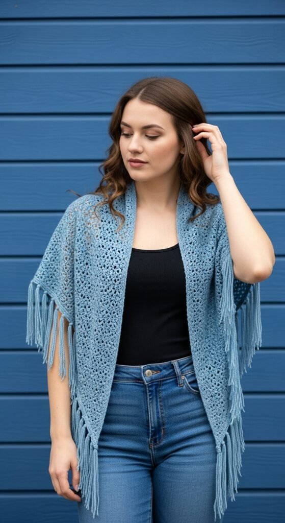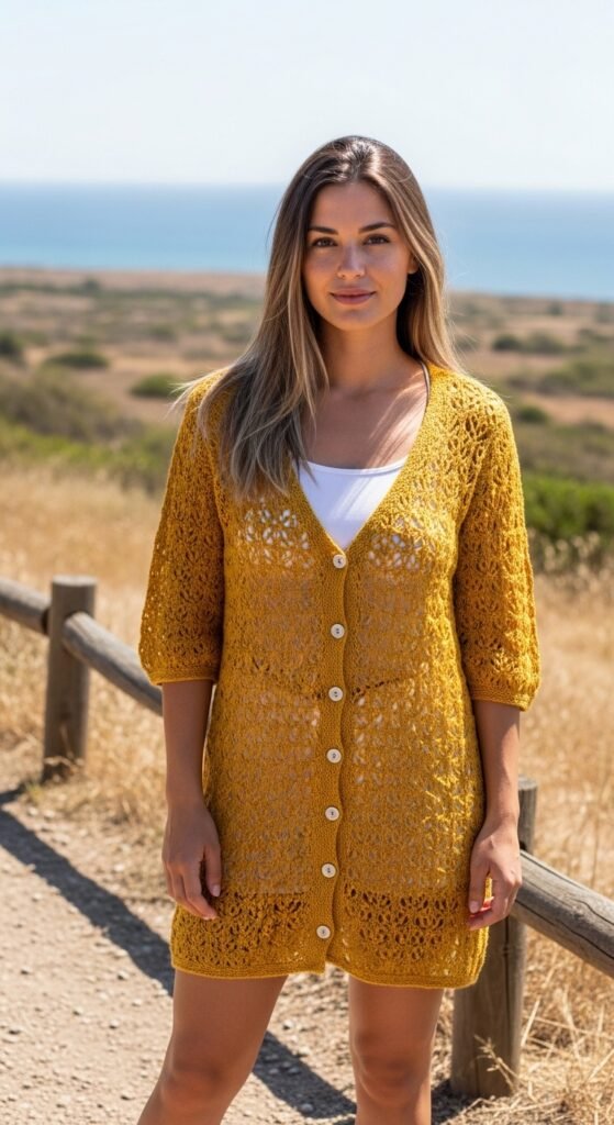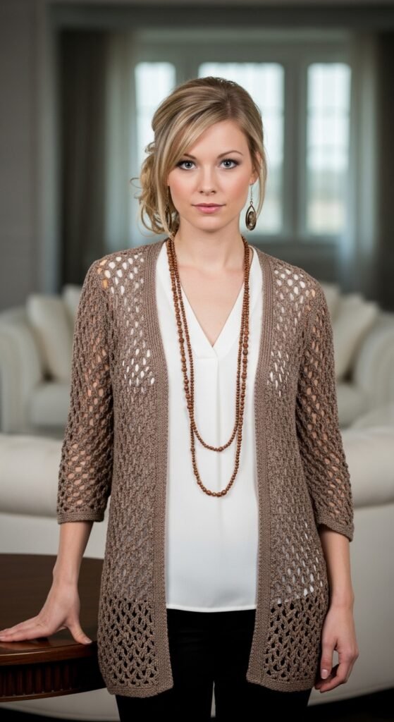 The stitch definition here is often open and airy, making it breathable enough for warmer days while still adding visual interest to a plain white tee. The lack of sleeves makes this a faster project than a full sweater, perfect for crocheters who lose patience with “sleeve island.” You can belt it for a cinched waist or leave it open for a bohemian vibe.