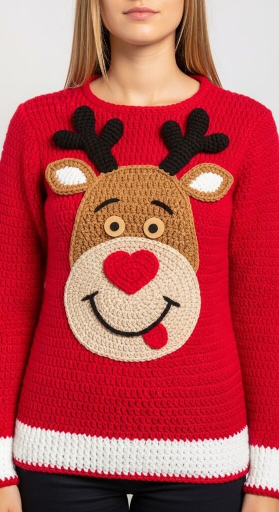 Holiday sweaters do not have to be ugly. This pattern uses a pixel-art approach, often called tapestry crochet or corner-to-corner (C2C), to create a reindeer motif. The result is a graphic, modern festive sweater that looks knit rather than crocheted.