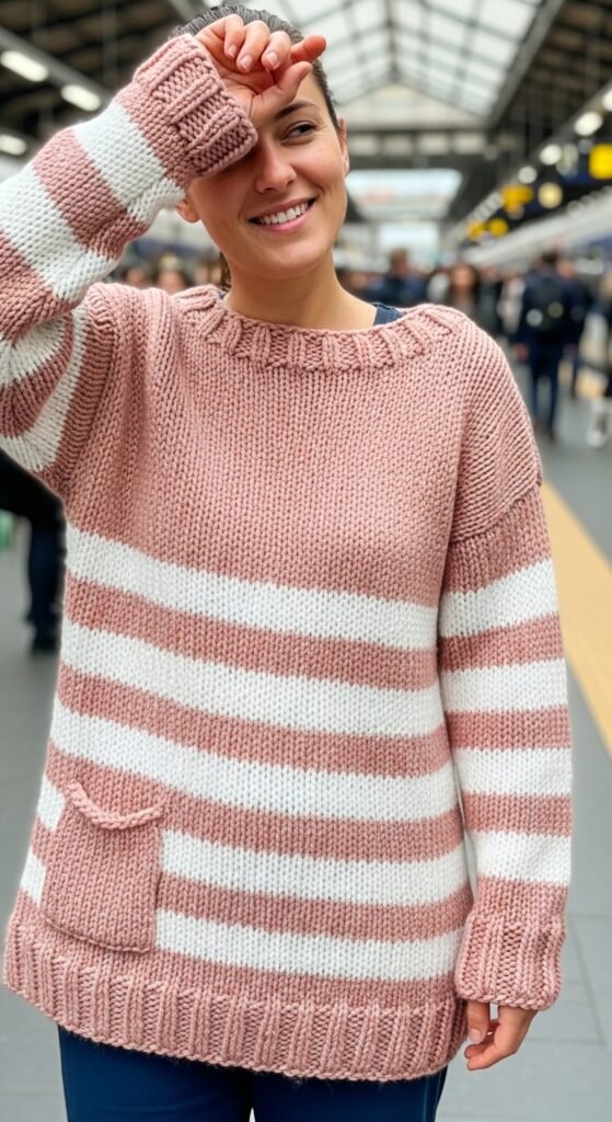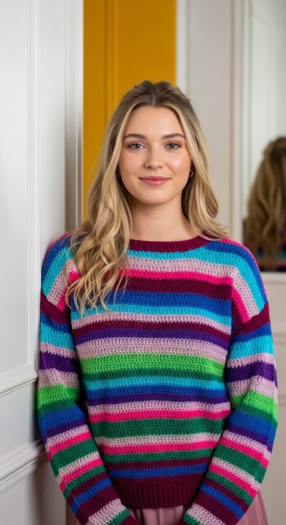 Striped sweaters are excellent for using up leftover balls of yarn from previous projects. You can mix different brands as long as the weight is consistent. The result is a one-of-a-kind garment that expresses your personality and creativity vividly.