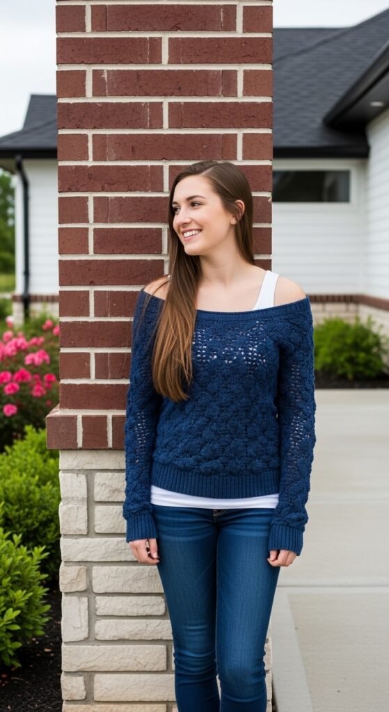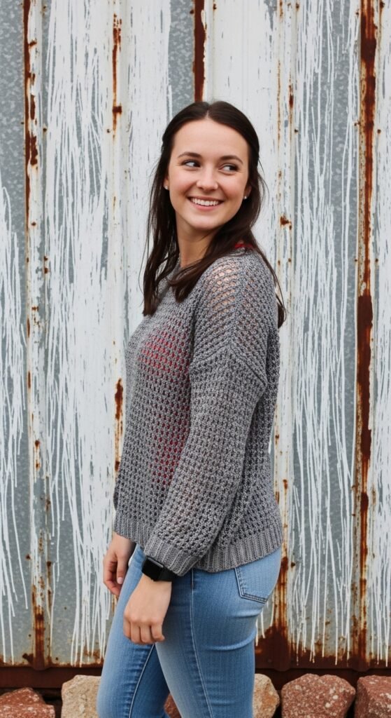 The beauty of the Homebody Sweater lies in its understated texture. Simple stitches like half-double crochet are often used to create a fabric that is smooth and modern. It avoids the “holey” look of traditional granny squares, making it a practical choice for wearing out of the house without needing a camisole underneath.