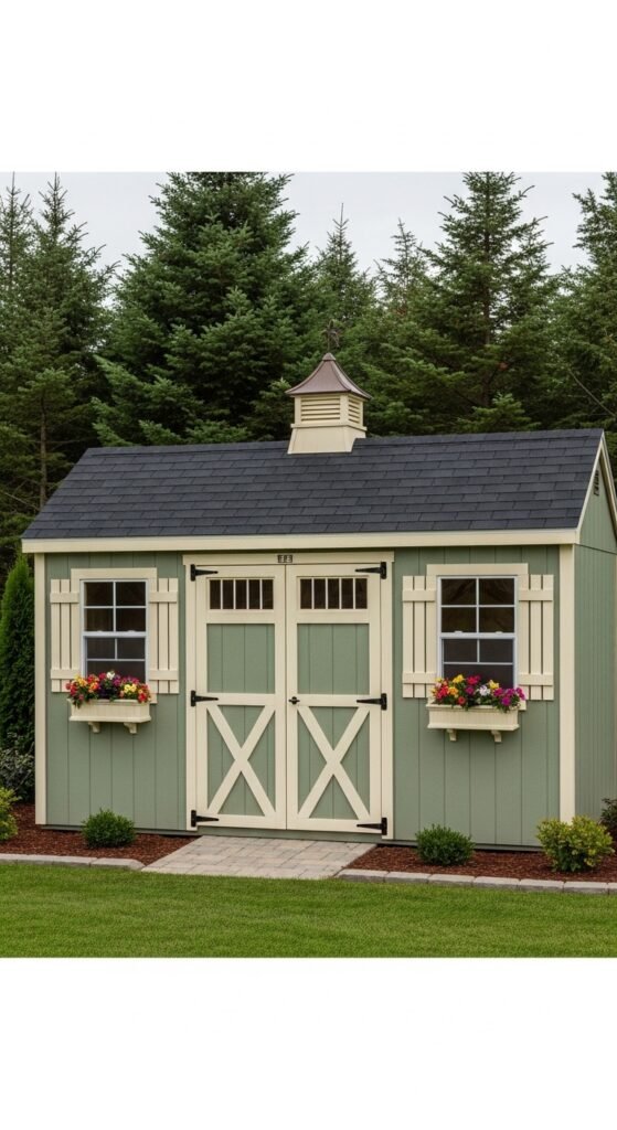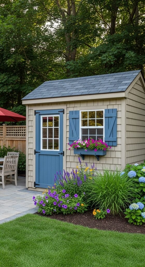 This shed is designed to be the center of a cutting garden. Painted a cheerful sky blue or periwinkle, it features trellises attached directly to the exterior walls, allowing climbing roses or clematis to wrap the structure in blooms. It feels alive and integrated with the garden beds.