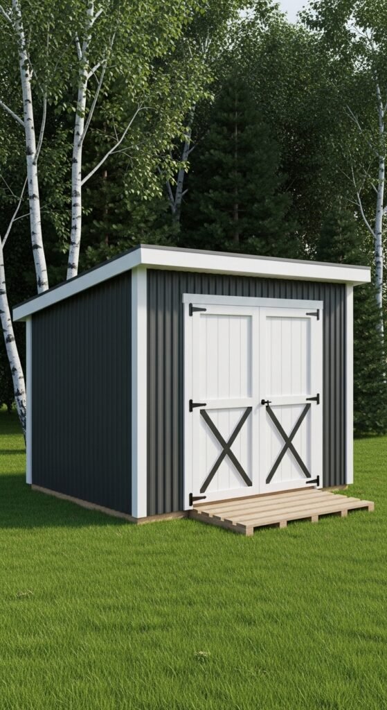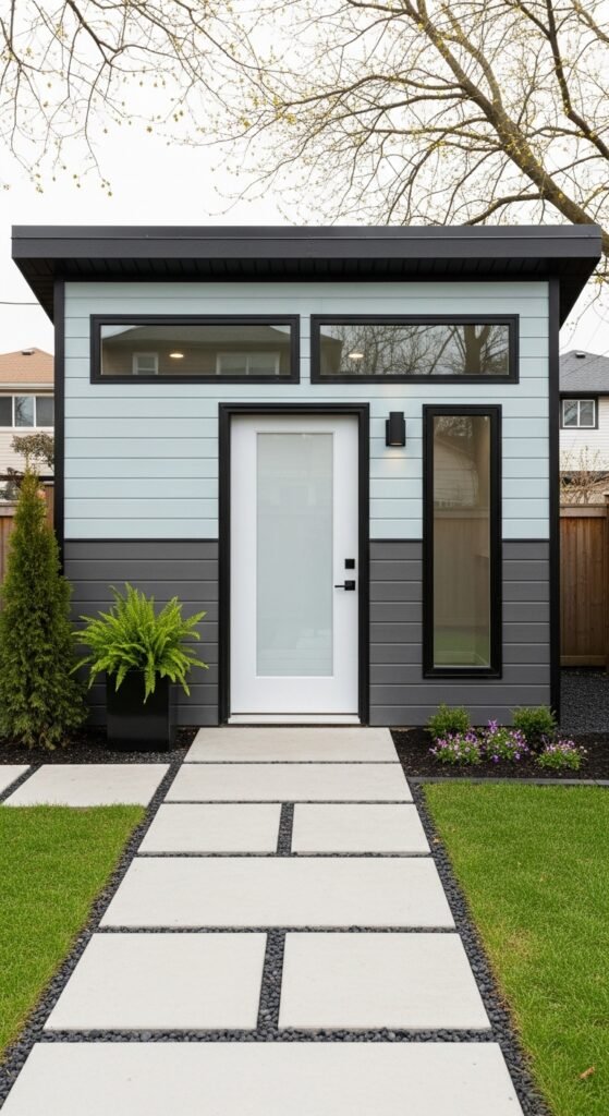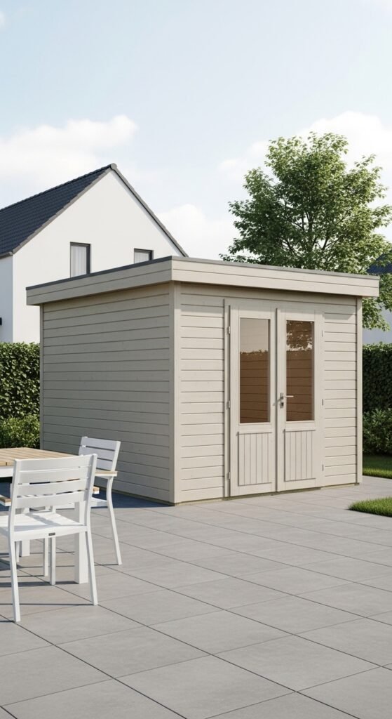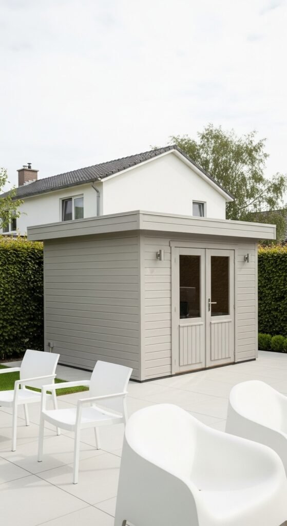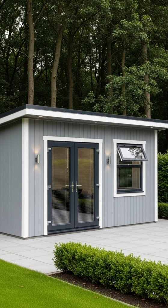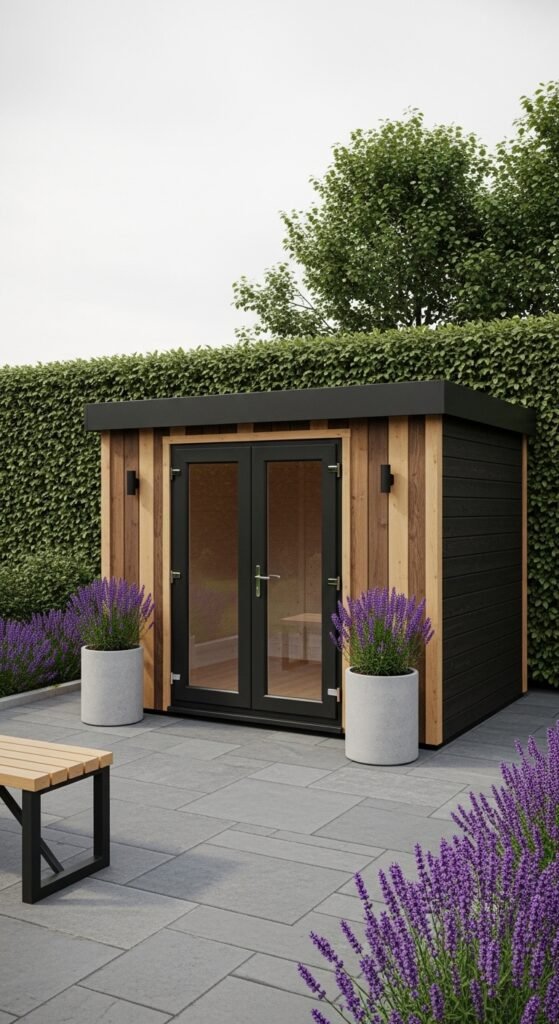 This is the shed for the ultra-modernist. It is often a perfect cube, clad in matte black fiber cement panels or charred wood (Shou Sugi Ban). There is no roof overhang; the water drains via an internal slope. A single, floor-to-ceiling window creates a dramatic connection with the outdoors, turning the view of the garden into a living painting.