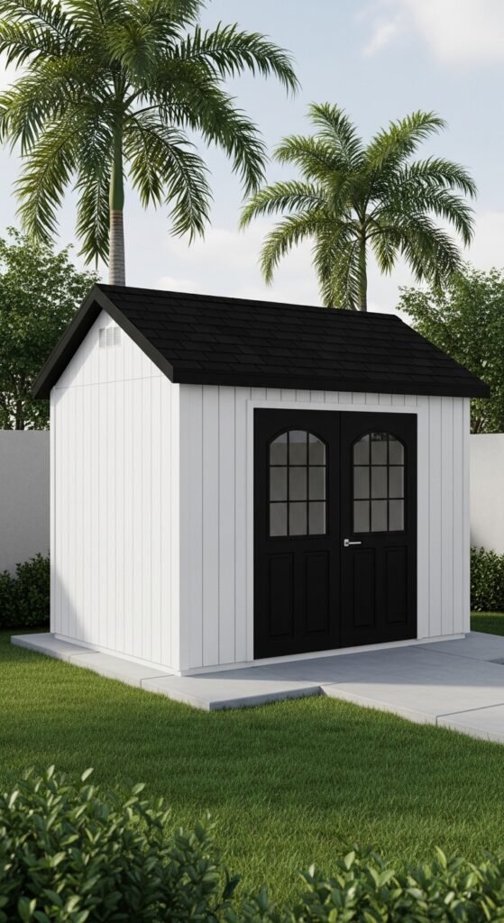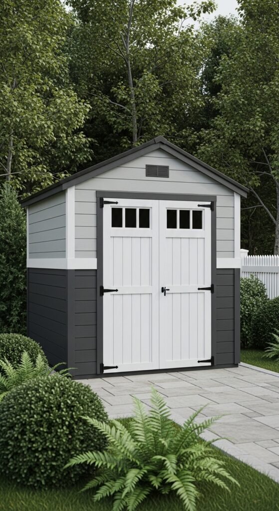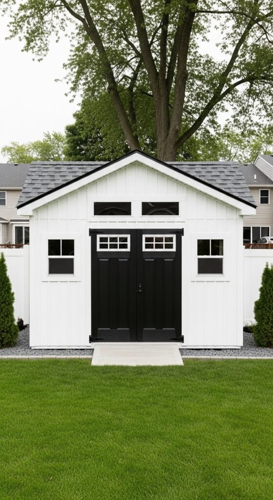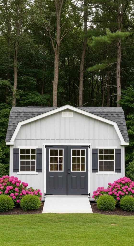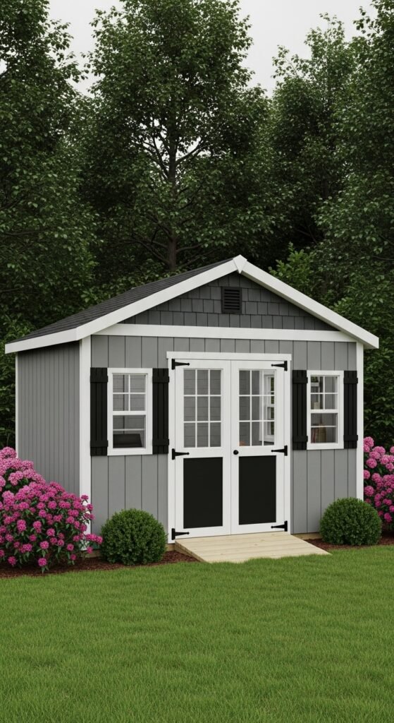 Taking cues from Scandinavian design, this shed features stark white or light grey vertical siding, a simple black door, and absolutely no unnecessary ornamentation. The beauty lies in the proportions and the negative space. It creates a calming visual break in a busy, colorful garden.