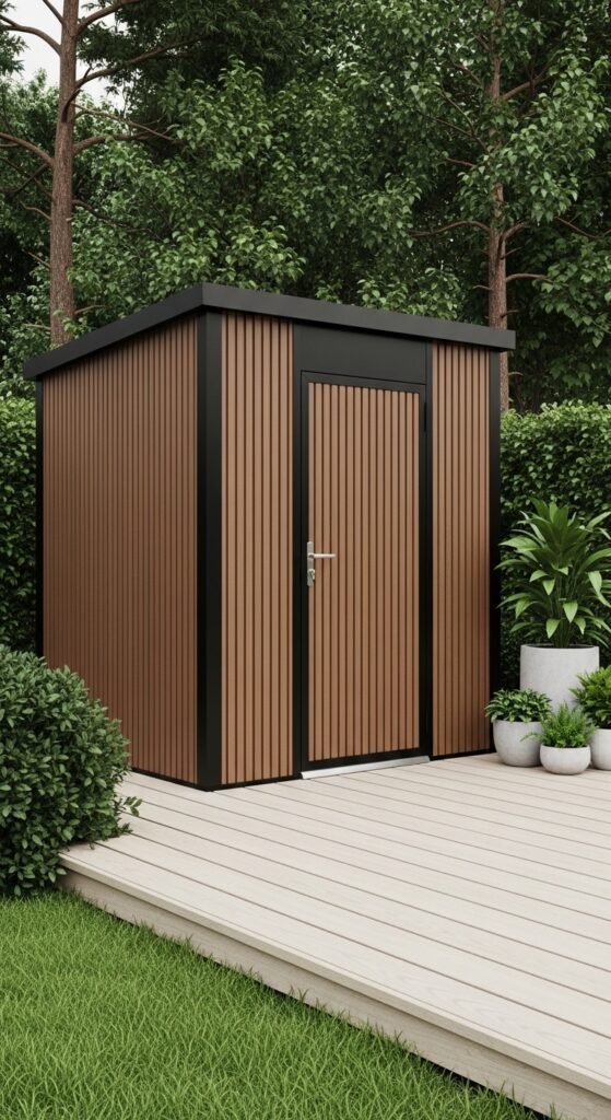 Minimalism defines this storage solution, which prioritizes function without clutter. The design features a flat or single-slope roof and smooth exterior cladding, often in charcoal, black, or deep cedar tones. The doors are frequently hidden or designed to blend seamlessly with the siding, creating a monolithic appearance. This style is perfect for urban backyards where space is tight and visual noise needs to be minimized.