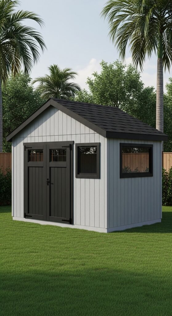 This style is particularly popular in coastal areas or for sheds located near a pool. Inside, moisture-resistant materials are key. Beadboard made from PVC or treated wood resists humidity and looks classic. Hooks for towels and storage for pool noodles make it a highly functional addition to a swimming area.