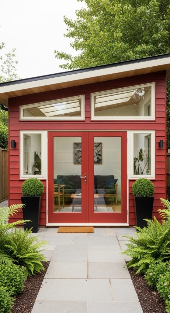Industrial design meets backyard comfort in this trend-setting structure. The use of galvanized steel siding offers a sleek, monochromatic look that contrasts beautifully with soft garden greenery. Unlike traditional wooden structures that may rot over time, metal offers superior resistance to pests and fire. The interior often features polished concrete floors and exposed beams, creating a raw yet refined studio space. To soften the harshness of the metal, designers often incorporate large glass sliding doors that flood the space with natural light.