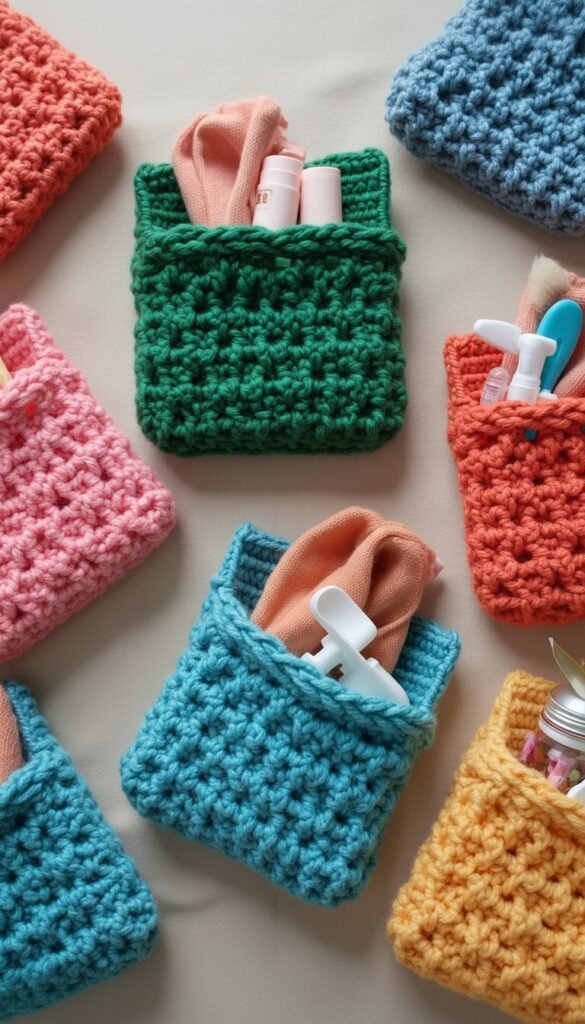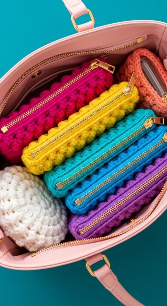 Zippered pouches or buttoned clutches are versatile organizers for makeup, pencils, or crochet hooks. Visually, a lined crochet pouch looks incredibly high-end. The texture of the crochet exterior contrasts beautifully with a smooth fabric lining. You can experiment with textured stitches like the “bobble stitch” to create fun, raised polka dots on the surface.