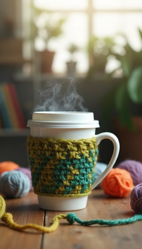 Cup sleeves, or “cozies,” are eco-friendly alternatives to the cardboard sleeves you get at coffee shops. They keep your drink hot and your hands cool. These are fantastic scrap-busters and make excellent gifts for teachers or coworkers. The aesthetic can range from simple ribbed designs to character-themed sleeves with ears and faces.