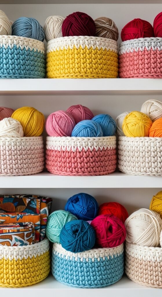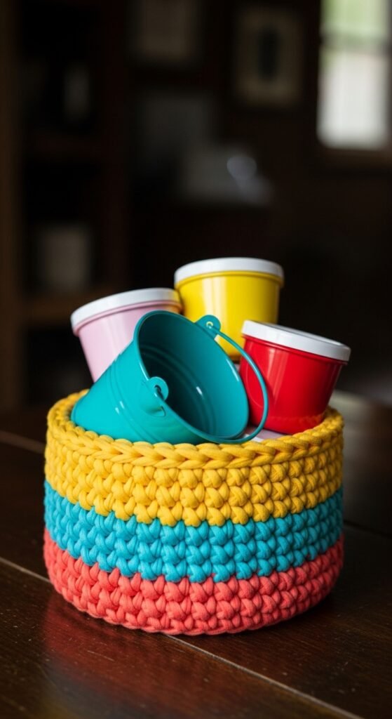Sturdy crochet baskets are perfect for organizing your home. They can hold remote controls, keys, or even your yarn stash. The aesthetic is clean, modern, and organizational. Using a super bulky yarn or “t-shirt yarn” gives the basket thick, rigid walls that stand up on their own.