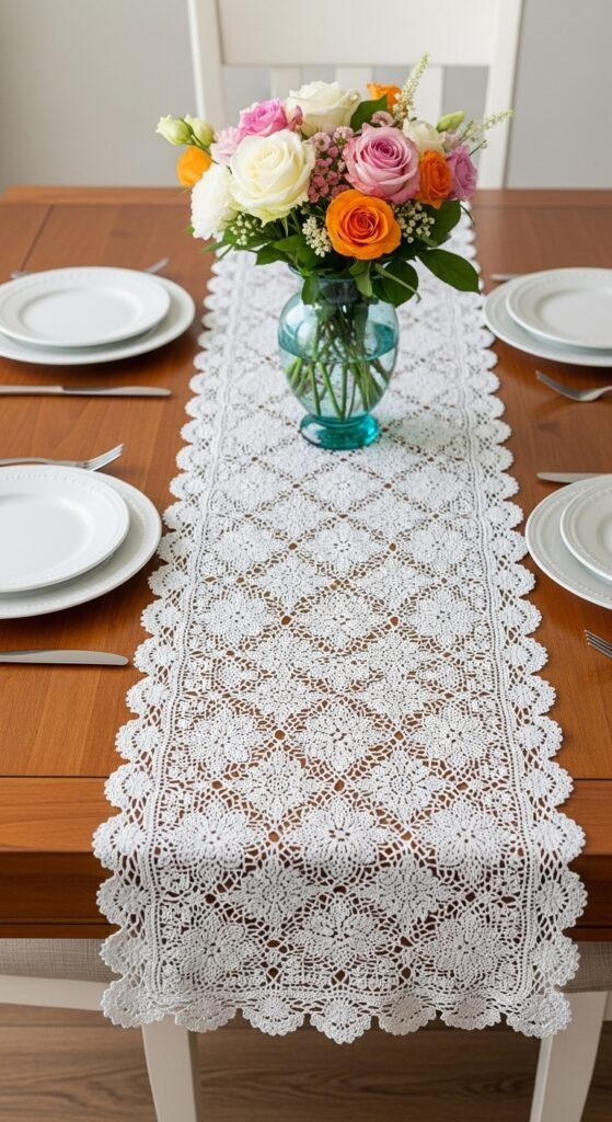 A table runner adds a festive or elegant touch to a dining table. It is essentially a very long, narrow scarf for your table. The aesthetic can be lacy and delicate for a wedding vibe, or chunky and colorful for a fiesta vibe.