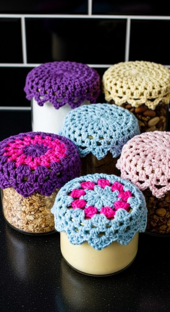 Transform recycled glass jars into beautiful storage containers with crochet toppers. These are little “hats” for your jam jars or mason jars. You can use them to hold cotton balls, candy, or spices. Visually, they add a soft, cottage-style touch to hard glass surfaces.