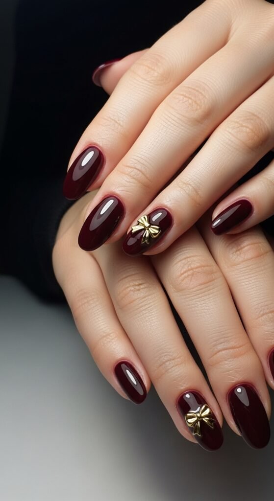 Pro Tip: Use a matte top coat over the burgundy but keep the gold bow glossy for a striking textural contrast.