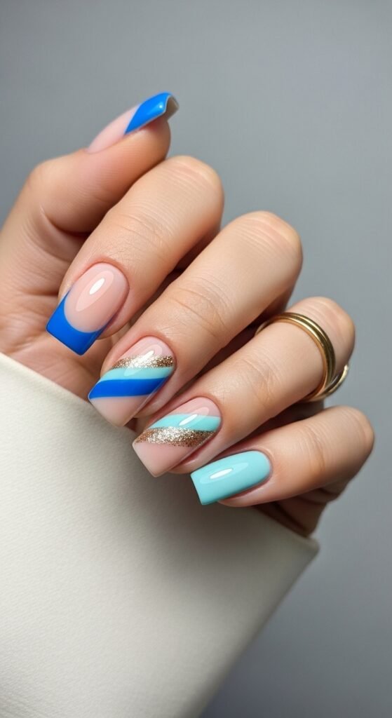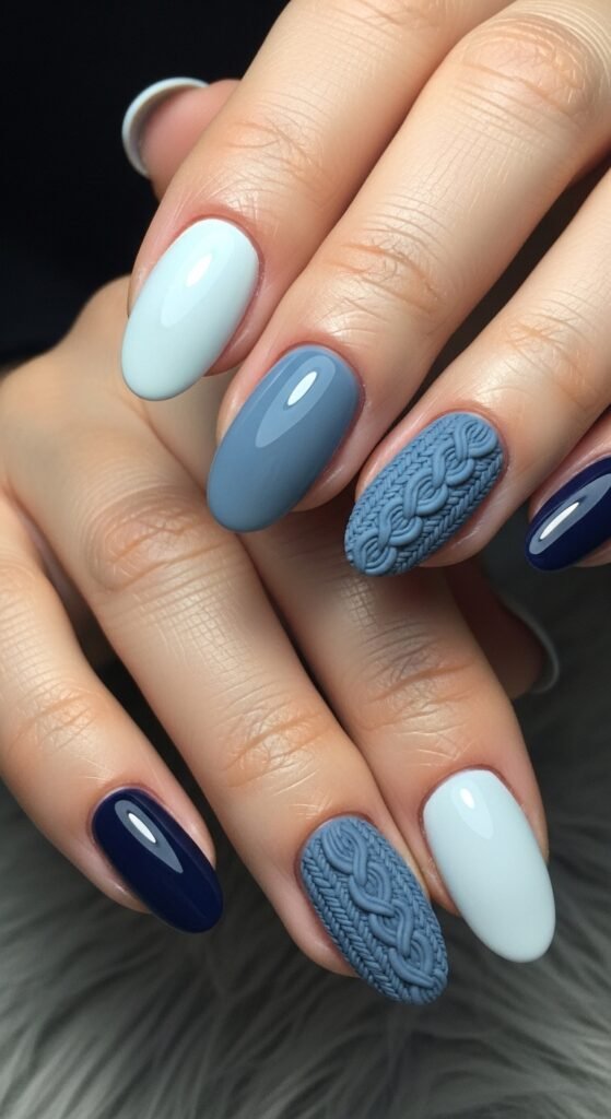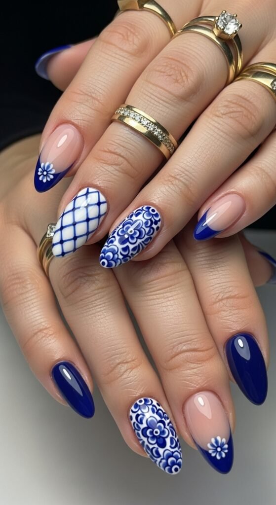 Similar to the gradient look, this style uses different blue shades but incorporates patterns. One nail might be solid navy, another a blue-on-blue swirl, and a third a blue French tip. It is a “mix and match” approach that feels curated rather than messy.