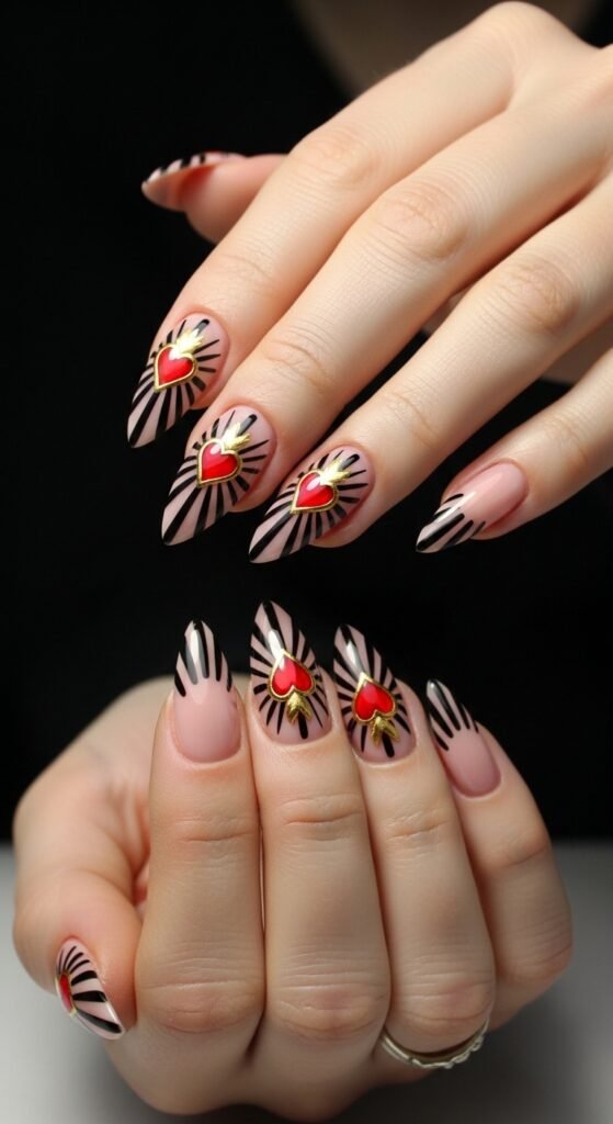 Simple Nude Nails + Red Hearts + Gold