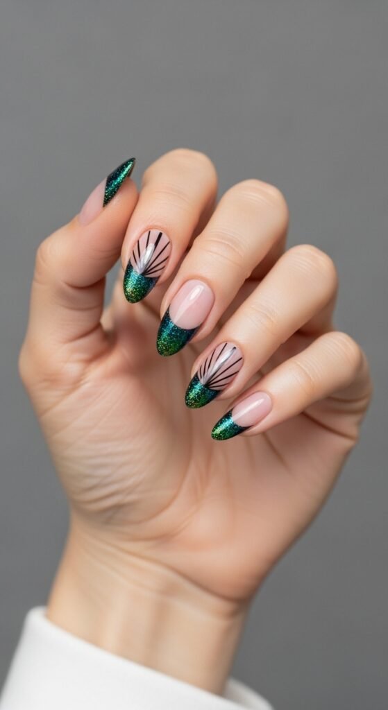This is the party girl’s transition to the quiet season. You keep the nude base (the “quiet” part) but swap the classic white French tip for a black glitter tip. The glitter should be fine, not chunky, to keep it sophisticated.