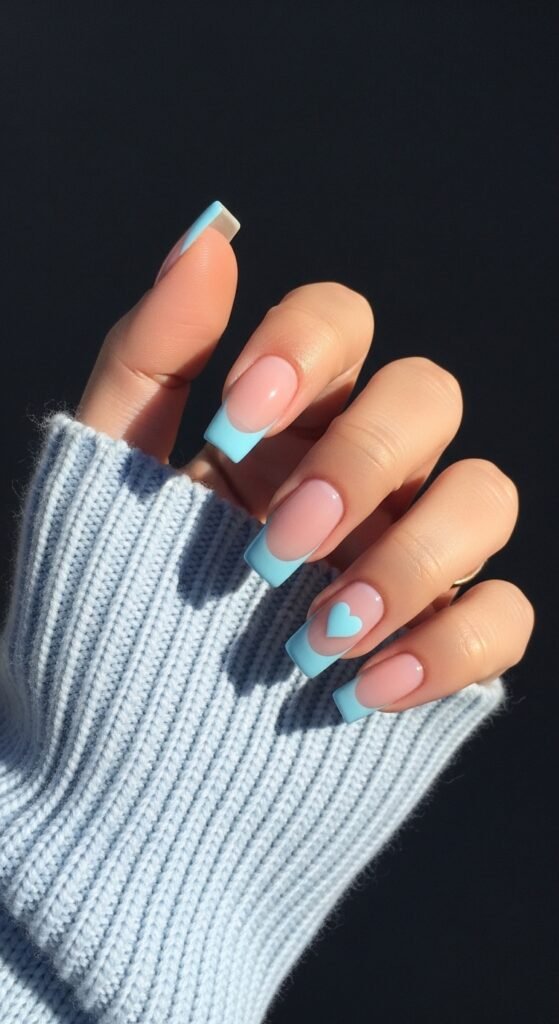 The base color should be a cool-toned pink or a milky beige to complement the blue. Unlike the warm, bubblegum pinks of summer French tips, this base needs to be muted. The blue tip should be thin—a “micro French”—to keep the look delicate. This style elongates the fingers and looks incredibly clean.