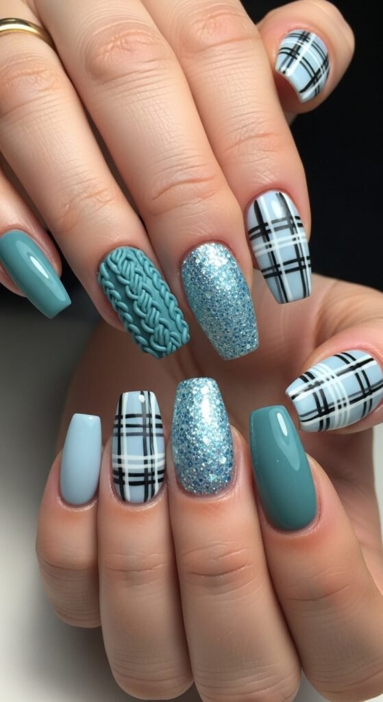 This is a very tactile manicure. You will find yourself rubbing your thumb over the ridges of the sweater nail. It is the ultimate cozy aesthetic. The plaid adds a touch of structure and pattern mixing. This style screams “cabin getaway” and pairs perfectly with wool mittens.