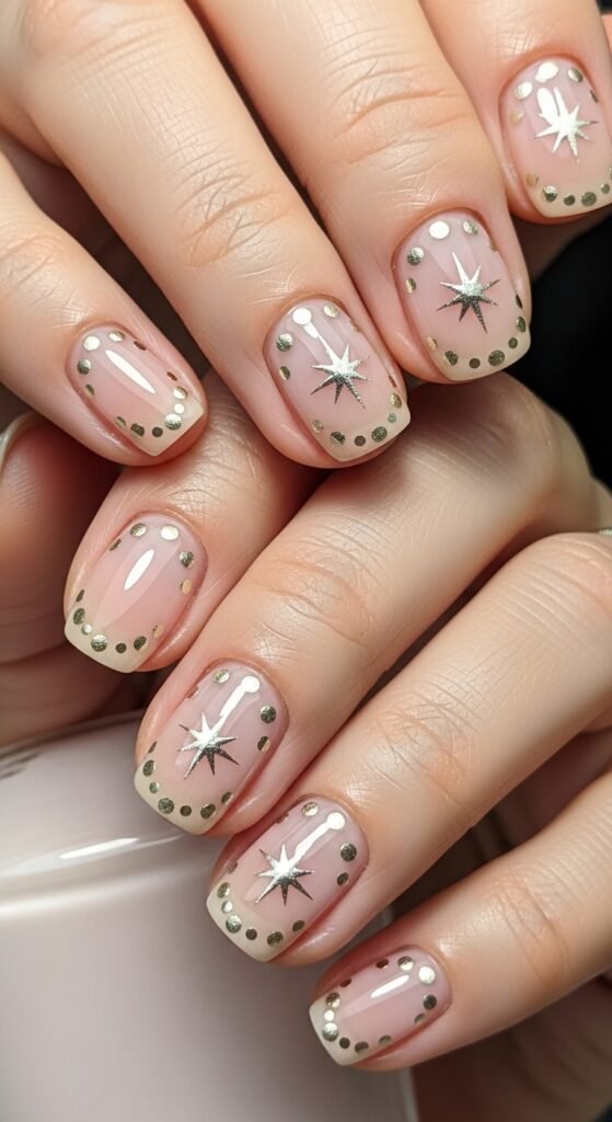 This whimsical design takes a standard nude manicure and adds a celestial twist. Tiny, four-point silver stars are scattered across the nails. The center of each star features a microscopic dot of pink or blue. It is a subtle nod to the clear, starry nights of mid-winter.