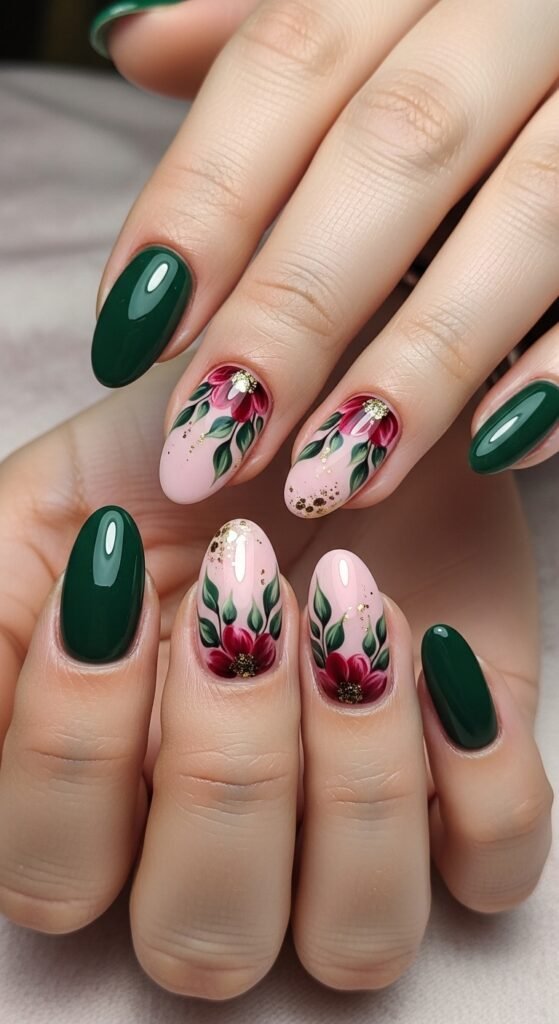 Move over, Christmas pine. This green is muted—think sage, olive, or a deep moss. It is an earthy, grounded color. The solid green nails are paired with accent nails featuring vintage-style winter florals (creams, browns, and muted greens) on a nude base.