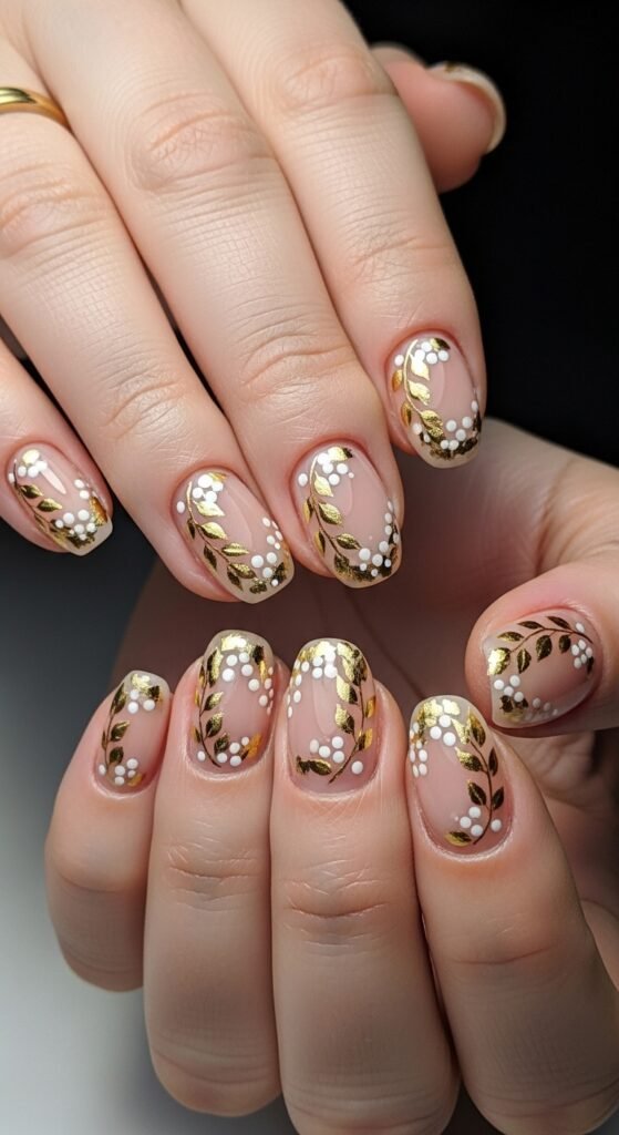 - Nude Nails + Gold Leaf + White Berries
