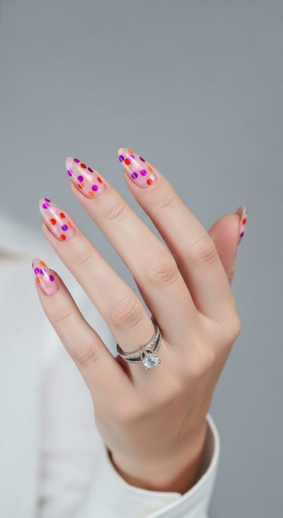 Imagine a nude nail, but covered in polka dots made of glitter. The dots can be uniform or varying sizes (confetti style). The base remains negative space or a very sheer wash of color.