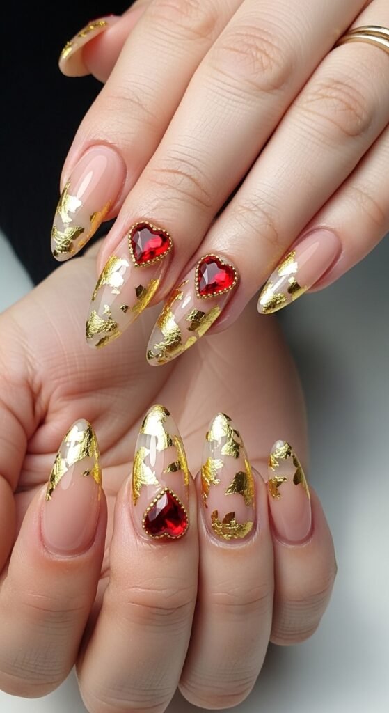 - Simple Nude Nails + Red Hearts + Gold