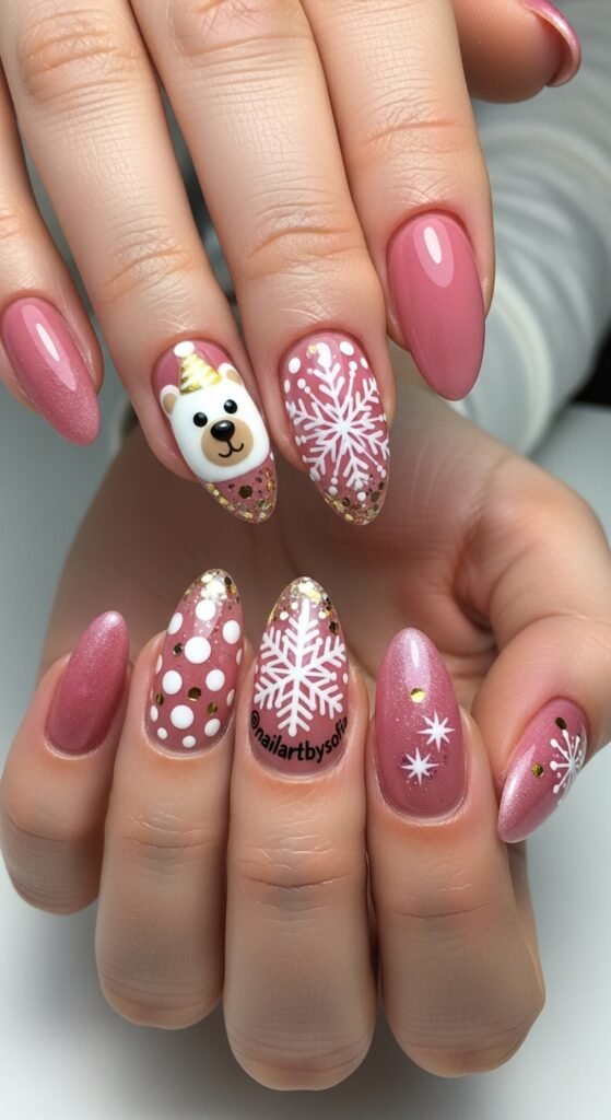 This is the “kawaii” (cute) winter option. A soft pink base features hand-painted white polar bears or teddy bears. Surrounding the bears are white snowflakes, hearts, or sweater patterns.