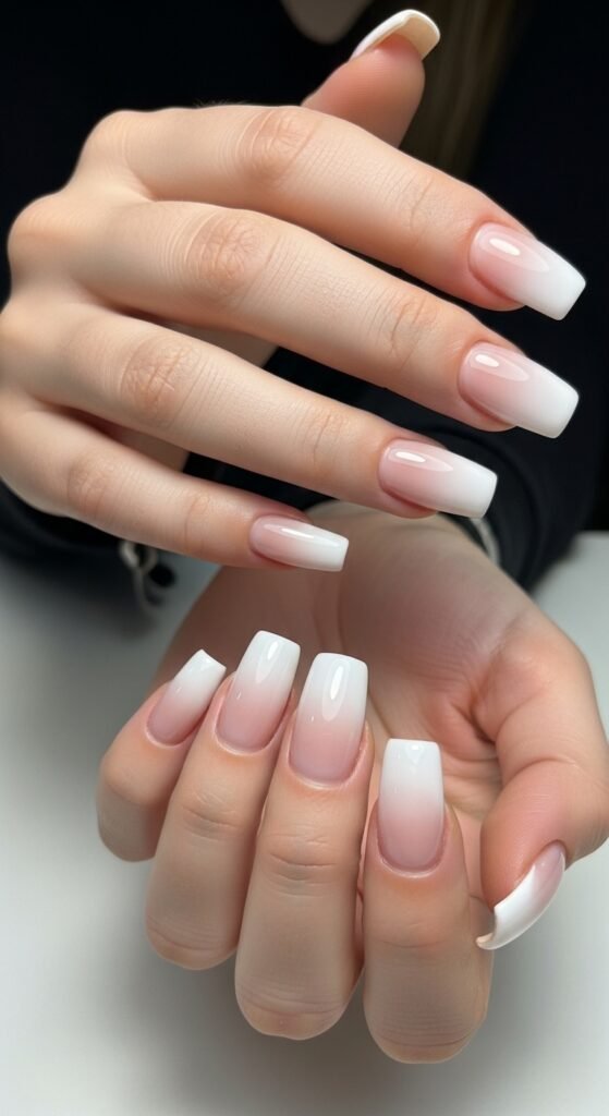 Also known as “Baby Boomer” nails or French Ombre. The transition from pink at the cuticle to white at the tip is seamless and airbrushed. The shape is a sharp square, which modernizes the classic gradient.