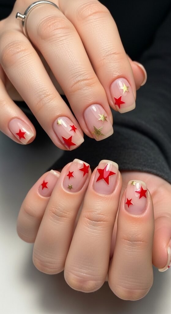 - Pink Nude Nails + Gold + Red Stars
