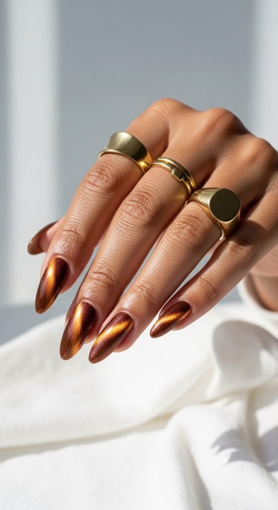 We end with a showstopper. Brown chrome (often called “chocolate glazed donut” nails) creates a metallic, liquid-bronze look. Pair this with accent nails of full gold glitter.