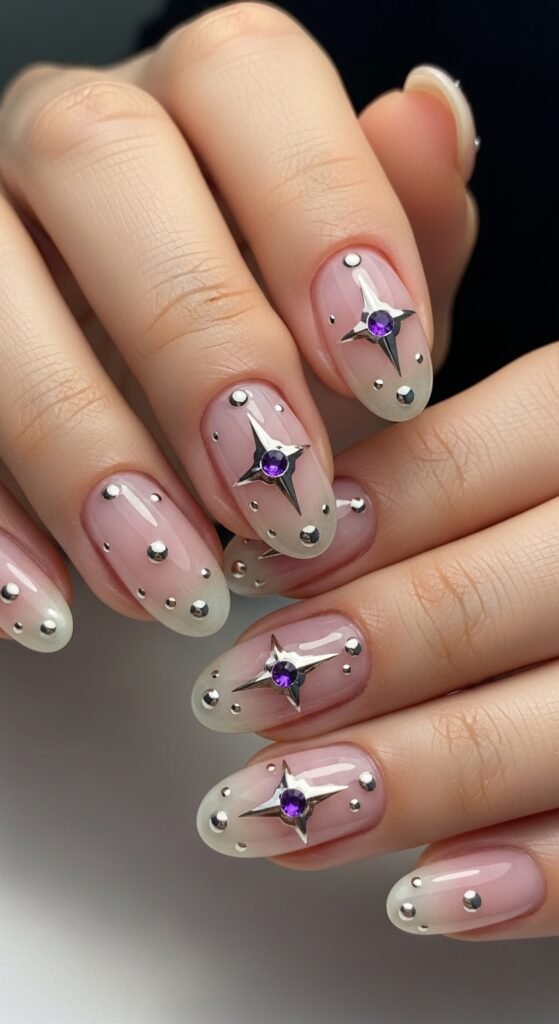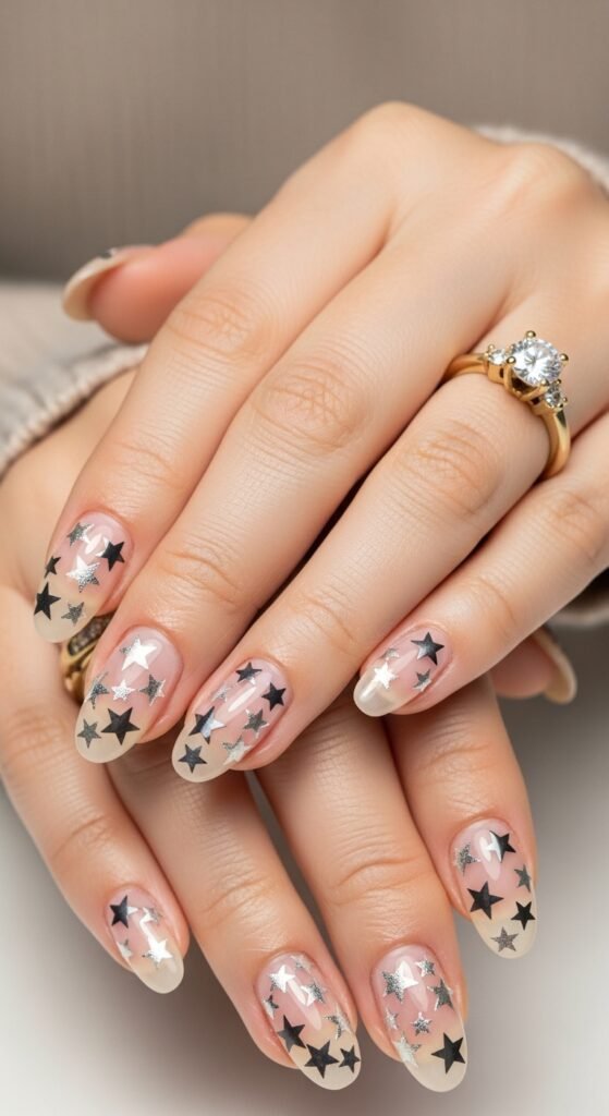 The base should be a “your nails but better” shade—translucent and glossy. The silver stars should be painted with a metallic liner gel or chrome powder for maximum reflection. The tiny dots of color add a playful element that prevents the look from being too stark. This is a perfect office-appropriate design that still shows off your personality when someone looks closely.