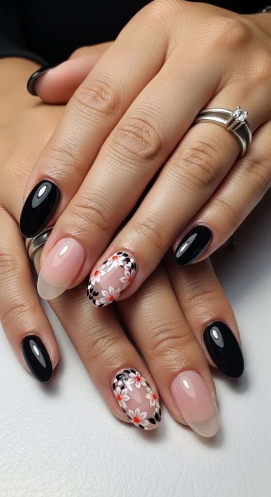 - Black Nails + Half & Half French Nails + Floral Accents