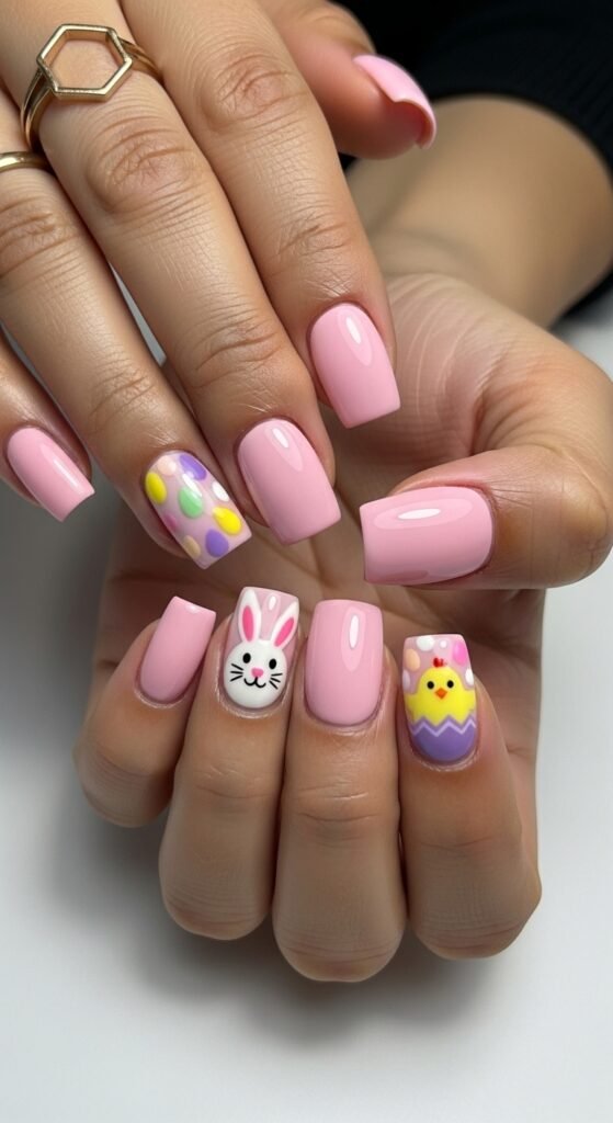 - Pastel Pink Squoval Nails with Adorable Easter Egg and Bunny Accents