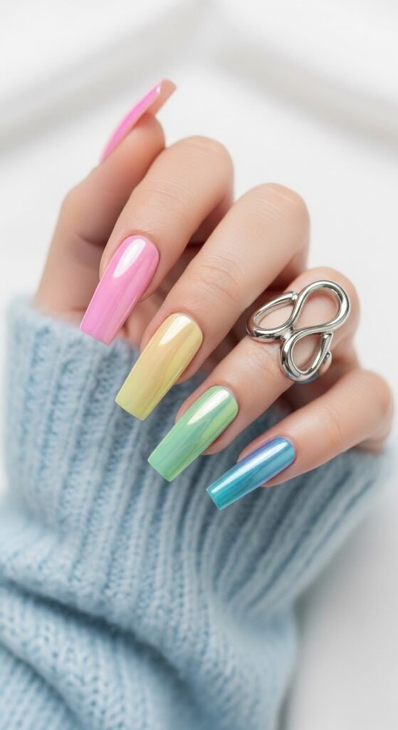 - Pastel Rainbow Chrome Coffin Nails