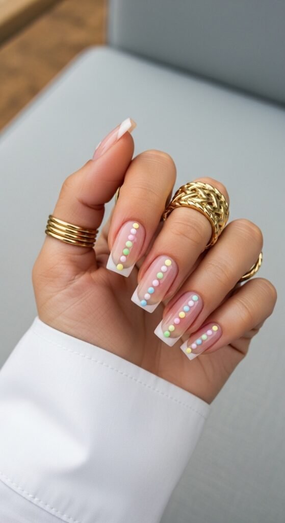 Polka dots are timeless. This design uses a solid pastel pink base on three nails. The two accent nails are white or nude, covered in rows of tiny, multicolored dots. The square shape gives the pattern a neat, geometric feel.